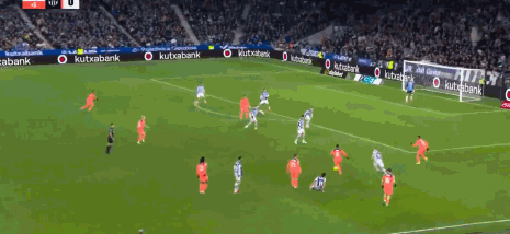 伤停补时第2分钟,佩德里妙传,亚马尔禁区右侧插上,小角度起脚兜射,雷米罗飞身单掌将球扑出,皇家社会逃过一劫。